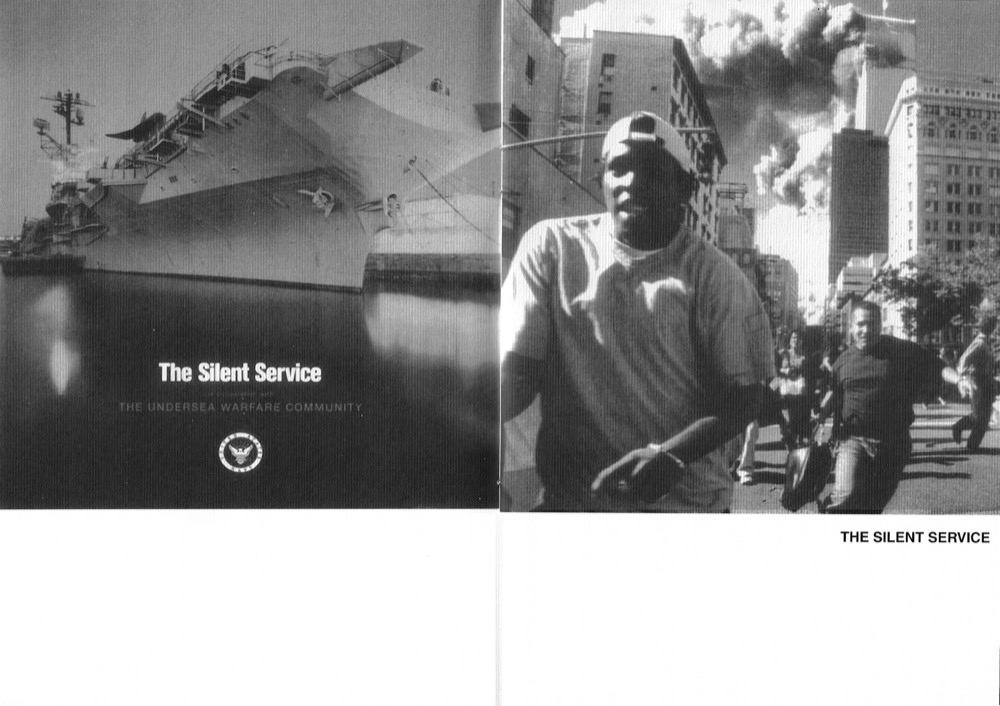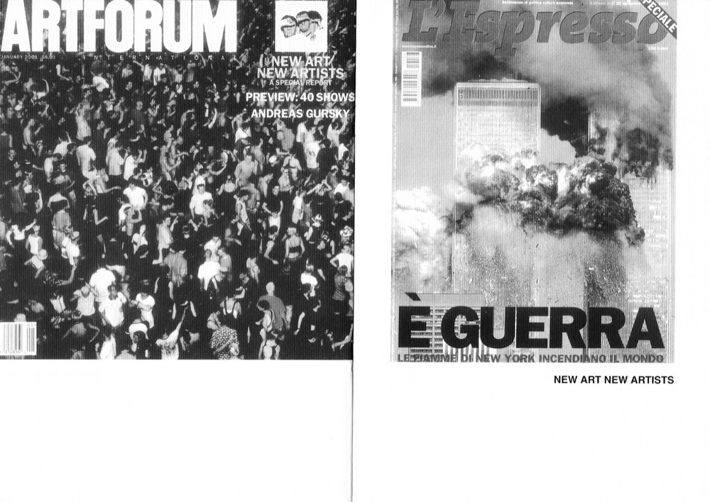 settembre 2001: si cambia?». Esso è costituito da tre scatti del crollo delle Torri Gemelle accostati ad immagini pubblicitarie e due copertine di periodici italiani dedicate all’evento affiancate alle copertine contemporanee di Artforum e Flash Art. Il libro poi si chiude con un