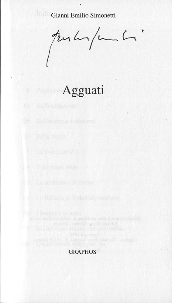 Descrizione: copertina illustrata con la riproduzione di una immagine in bianco e nero, alcuni disegni dell'autore n.t. Prefazione di Carlo Romano. Esemplare con firma autografa dell'autore al frontespizio. Raccolta di testi dal 1980 al 1990. Prima edizione.