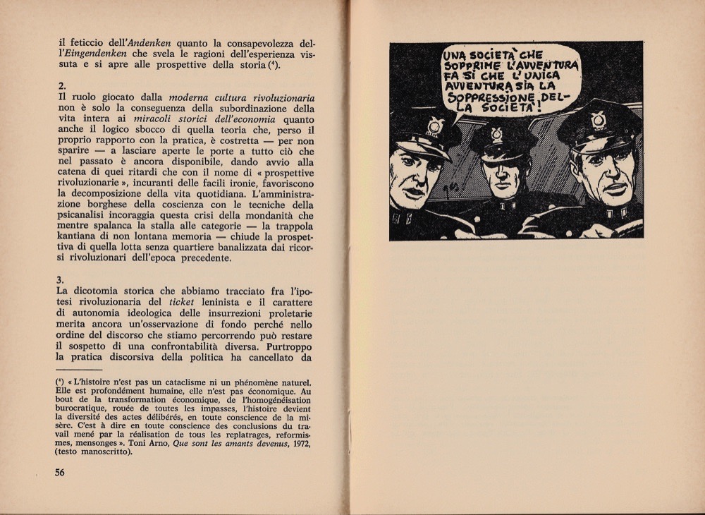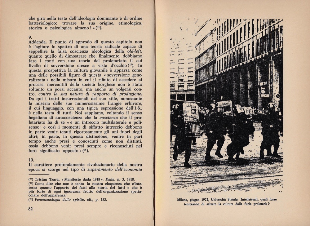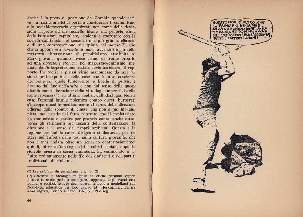 "La «cosa» della rivoluzione, fuori dall'enfasi del grossolano ritardo critico-pratico leninista e maoista, o dei giovanilisti entusiasmi della cultura alternativa pacifista e psichedelica, deve sapersi porre come la «cosa reale», lo strumento pratico capace di separare il mondo caotico multiforme e disperato da ciò che finalmente è divenuto noto al proletariato... In questo pamphlet... il tema è duplice: la ragione di quella teoria che è nemica di ogni ideologia e sa di esserlo, al di fuori della facili illusioni barricadere del maggio '68 o dei pic-nic a Woodstock e sull'isola di Wight, quella teoria che «teppisti» come Korsch e Lukacs, per usare le parole di Stalin, Lefebvre, la Scuola di Francoforte, l'Internazionale Situazionista affermano ripetendo Marx; e la ragione di quel proletariato che «da tempo possiede il sogno di una cosa di cui deve soltanto possedere la coscienza, per possederla realmente»" (dal retro di copertina).