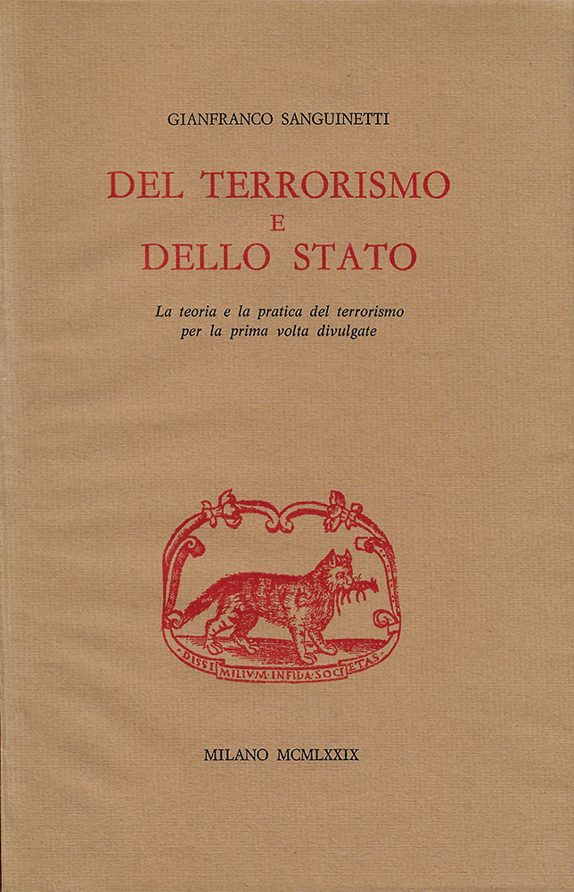 "Il pamphlet rappresenta un caso singolare in cui è l’autore a pubblicare abusivamente una propria opera. Sanguinetti aveva infatti ceduto a Mondadori i diritti dell’opera «Rimedio a tutto», di cui «Del terrorismo e dello Stato» rappresenta il decimo capitolo, nel quale si afferma lo stretto legame tra Stato e terrorismo. Pagata da Mondadori ma mai pubblicata, l’opera fu «liberata» dallo stesso autore in un’autoedizione. [...] L'edizione andò presto esaurita tant'è che l’anno successivo ne uscirono una seconda aumentata di 20 pagine, un estratto con la sola nuova prefazione nonché due diverse edizioni francesi, una edita a Grenoble e l’altra a Parigi. Altre edizioni apparvero successivamente in Inghilterra, Olanda, Germania, Portogallo, Spagna e Grecia" (Duccio Dogheria, «Pirati e falsi editoriali nell'Italia degli anni '70», Pitigliano, Associazione Strade Bianche, 2018: pp. 49-52).