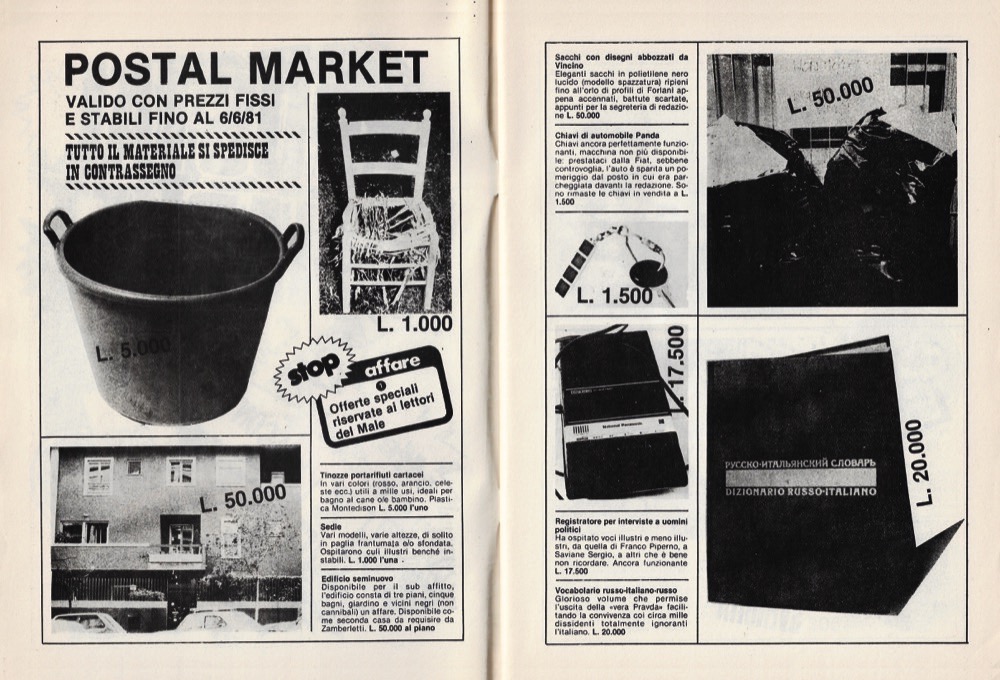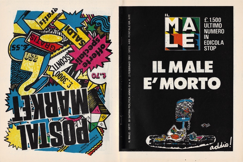 Descrizione: Flipbook diviso in due parti con doppia copertina: la prima parte, con copertina illustrata da un disegno a colori non firmato su fondo nero e titolo in bianco, contiene i testi e le storie a fumetti; la seconda parte «Postal Market», id 16 pagine, copertina con composizione grafica a colori, è un catalogo di vendita di oggetti, gadget e documenti del Male. All'interno del fascicolo l'inserto «I protagonisti di una grande avventura», con i ritratti fotografici di tutti i redattori e collaboratori della rivista. Ultimo numero della prima serie dell'anno IV. Esemplare in ottime condizioni di conservazione. Edizione originale.