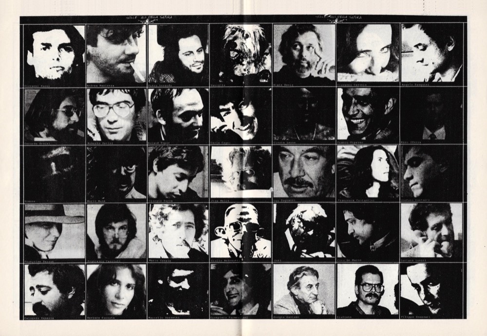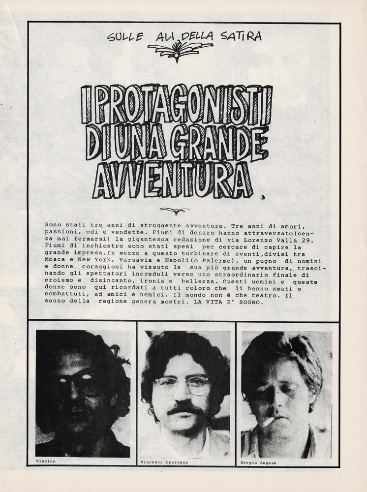 Redazione: Sergio Angese, Carlo Cagni, Giovanna Caronia, Francesco Cascioli, Ciro De Marco, Cinzia Leone, Karen (Jacopo Fo), Giampiero Parmeggiani, Roberto Perini, Stefano Santucci, Enzo Sferra, Vincenzo Sparagna, Vincino. Amministrazione: Guglielmo di Zenzo, Gerardo Orsini. Diffusione: Franco D'Ammicco, Simonetta Rimoldi. Non compaiono i nomi dei collaboratori. Disegni di Andrea Pazienza: una vignetta in bianco e nero a pag. 9: «Il pompino è una questione di sensibilità e di labbra non solo di ingoio!»; una pagina pubblicitaria a colori: «Andrea Pazienza in edicola la prossima settimana - Una serpe!». Con una lunga storia a fumetti di Alexis Constandi e Buzzelli («Il mestiere di Mario»).