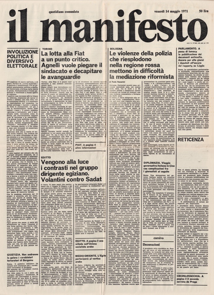 - n. 14 (14 maggio 1971): pp. 4. In prima pagina l’articolo anonimo: «Torino. La lotta alla Fiat a un punto critico. Agnelli vuole piegare il sindacato e decapitare le avanguardie». In ultima pagina l’appello a grandi caratteri: «Agnelli recupera vecchi strumenti repressivi, licenziamenti, arresti, lettere di minaccia. Ma la combattività operaia è sempre alta. Perché vinca occorre che il sindacato non arretri, ma si assuma la responsabilità dell’offensiva». Fra gli altri, articoli di Paolo Passarini, Ugo Bilardo, Collettivo San Basilio («Roma. Come nel quartiere di San Basilio si organizza e gestisce la lotta per la casa e la salute»), Pio Marconi, Valentino Parlato.