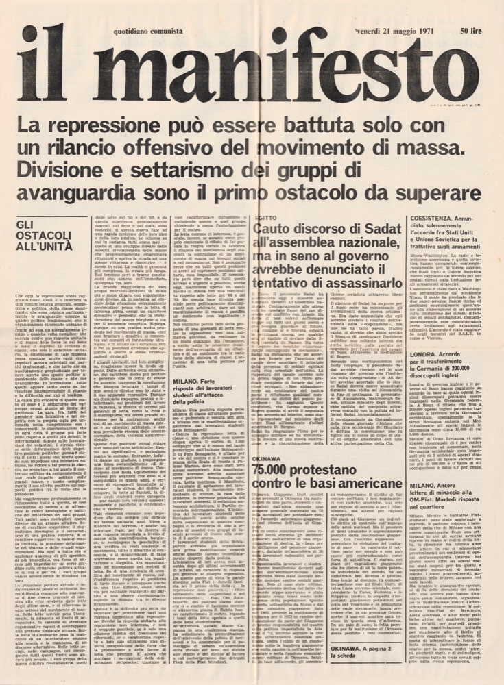 - n. 21 (22 maggio 1971): Sottotitolo in prima pagina: «Guardiani della Fiat di bari aggrediscono e feriscono lavoratori e sindacalisti. Magistratura e polizia contro gli operai della Rex-Zanussi»; pp. 4. Fra gli altri, articoli di Daniel Singer, Luigi Pintor («Il PCI e il 13 giugno»), Dan Georgakas («Pantere nere. Anche la montatura contro Bobby Seale rivela l’ordito della provocazione poliziesca»), Rossana Rossanda («Riparte il movimento. Quali piattaforme e quali obiettivi?», sul movimento degli studenti), Ninetta Zandegiacomi.