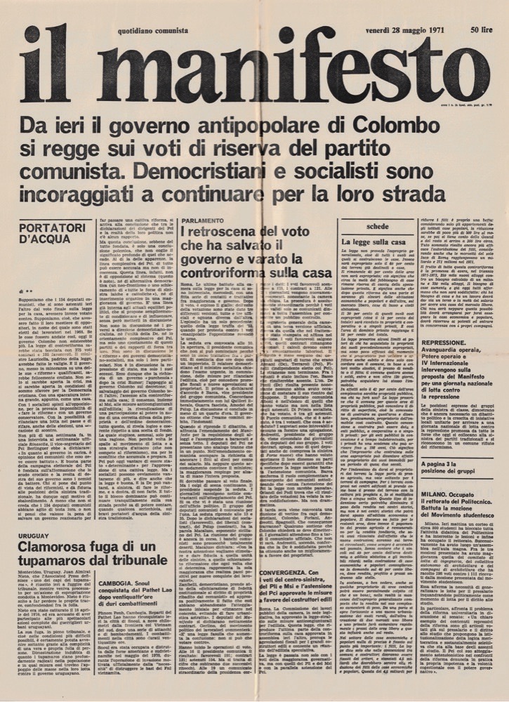- n. 38 (11 giugno 1971): pp. 4. Sottotitolo in prima pagina: «Il fronte di lotta per la casa si estende a Roma Firenze e Messina. Domani in corteo a Milano tutta la sinistra di classe». Fra gli altri, articoli di Sandro Bianchi, Lucio Magri («Dalla Fiat alle case dalle case alla Fiat»), Luigi Pintor («La tomba proibita», sulla ricusazione del giudice del tribunale che aveva ordinato di riaprire la tomba di Giuseppe Pinelli), Fedele Santi, Colin Harper, Valentino Parlato («Il Pci passa da “la terra a chi la lavora” al sostegno del piccolo imprenditore agricolo»), Gianni Montani,