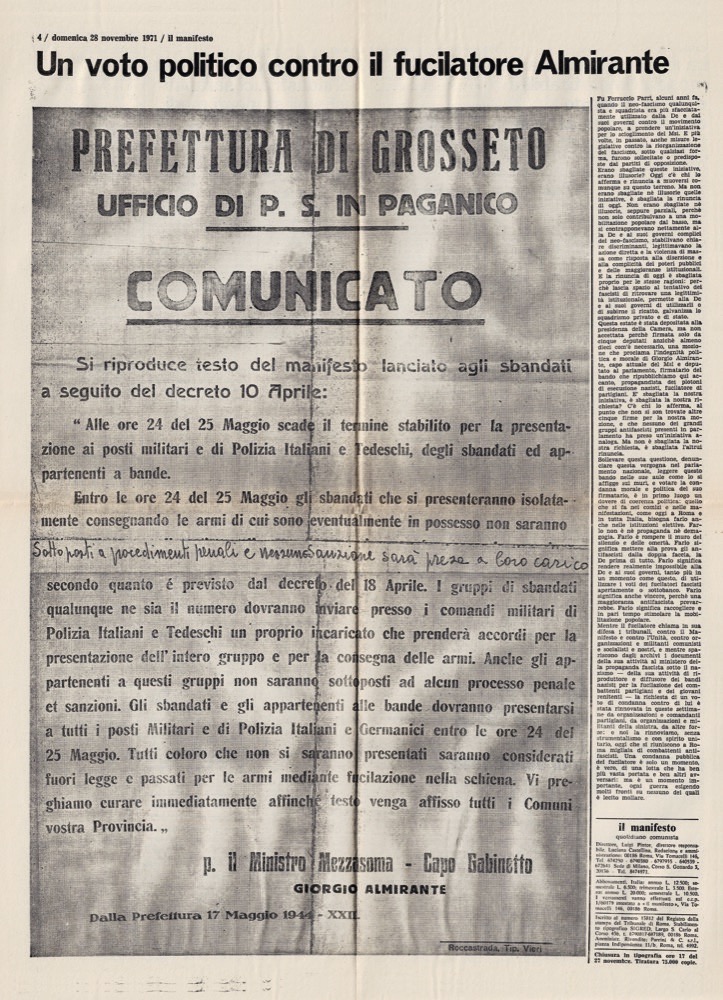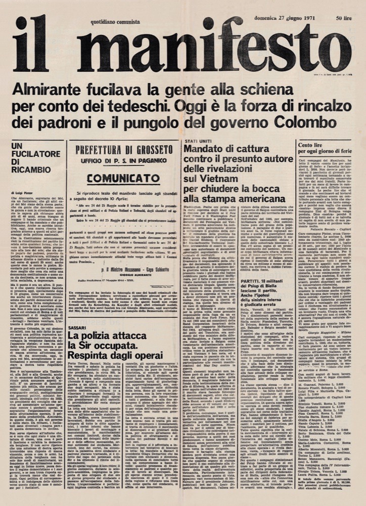 - n. 52 (27 giugno 1971): pp. 4. Sottotitolo in prima pagina: «Almirante fucilava la gente alla schiena per conto dei tedeschi. Oggi è la forza di rincalzo dei padroni e il pungolo del governo Colombo». Con la riproduzione in prima pagina di un comunicato della prefettura di Grosseto del 17 maggio 1944 sottoscritto da Giorgio Almirante, in cui è prevista la fucilazione alla schiena dei partigiani. Fra gli altri, articoli di Luigi Pintor («Un fucilatore di ricambio»), Paolo Passarini, Luciana Castellina.*