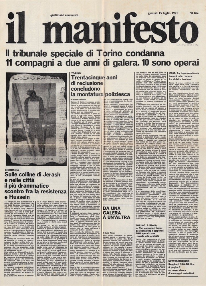 - n. 67 (15 luglio 1971): pp. 4. Sottotitolo in prima pagina: «Il tribunale speciale di Torino condanna 11 compagni a due anni di galera.10 sono operai», 1 immagine fotografica in prima pagina per l’articolo anonimo «Giordania - Sulle colline di Jerash e nelle città il più drammatico scontro fra la resistenza e Hussein» (“La fotografia che pubblichiamo è quella dell’operaio palestinese Galeb Said Ibrahim, impiccato il 7 luglio nel cortile della fabbrica di fosfati di Ruseiva dove lavorava, sotto l’accusa di aver effettuato un sabotaggio. La foto è stata pubblicata dal quotidiano di «Al Fatah», di cui il compagno Galeb era militante”). Fra gli altri, articoli di Gianni Montani («Trentacinque anni di reclusione concludono la montatura poliziesca» sull’esito del “processo ai cinquantasei” a Torino), Luigi Pintor («Da una galera all’altra»), Lucio Magri («L’Avanti l’estremismo e noi»), Mario Catalano, Corradino Mineo, Agostino De Benedictis.*