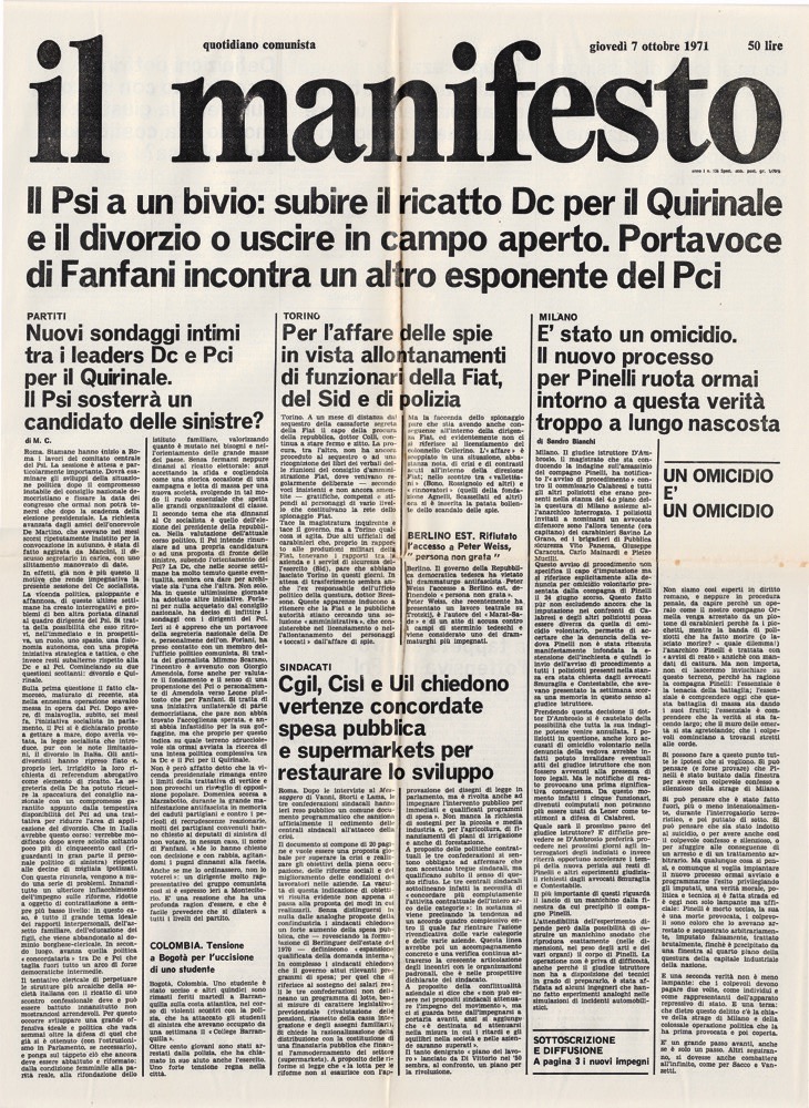 - n. 136 (7 ottobre 1971): pp. 4. Sottotitolo in prima pagina: «Il Psi a un bivio: subire il ricatto Dc per il Quirinale e il divorzio o uscire in campo aperto. Portavoce di Fanfani incontra un altro esponente del Pci». Fra gli altri, articoli di Sandro Bianchi («Milano - E’ stato un omicidio. Il nuovo processo per Pinelli ruota ormai intorno a questa verità troppo a lungo nascosta»), Lidia Menapace, Mario Sai.