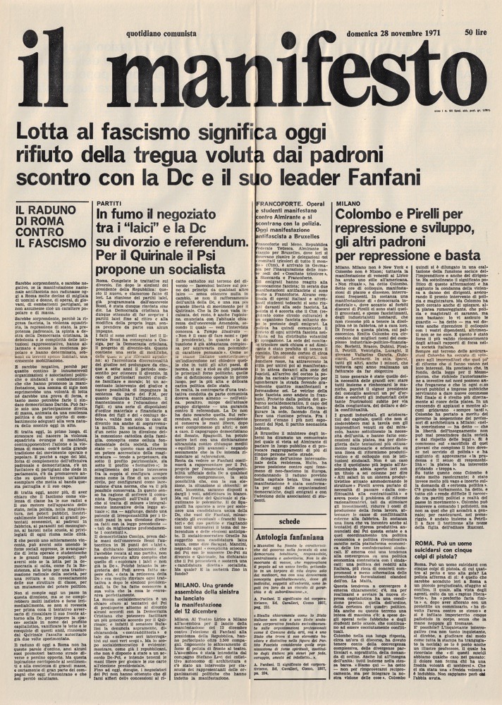 - n. 162 (6 novembre 1971): pp. 4. Sottotitolo in prima pagina: «Aperta ieri a Rimini l’assemblea dei delegati degli 86 centri del Manifesto. Quali sono le vere carte del candidato Fanfani». Fra gli altri, articoli di Pio Marconi («Chi ha paura del barone “ultras”»), Luca Redosti, Daniel Singer, Grazia Gaspari («Scuola - Nel sud più studenti che nel nord, perché è più forte la disoccupazione»), Aldo Garzia.