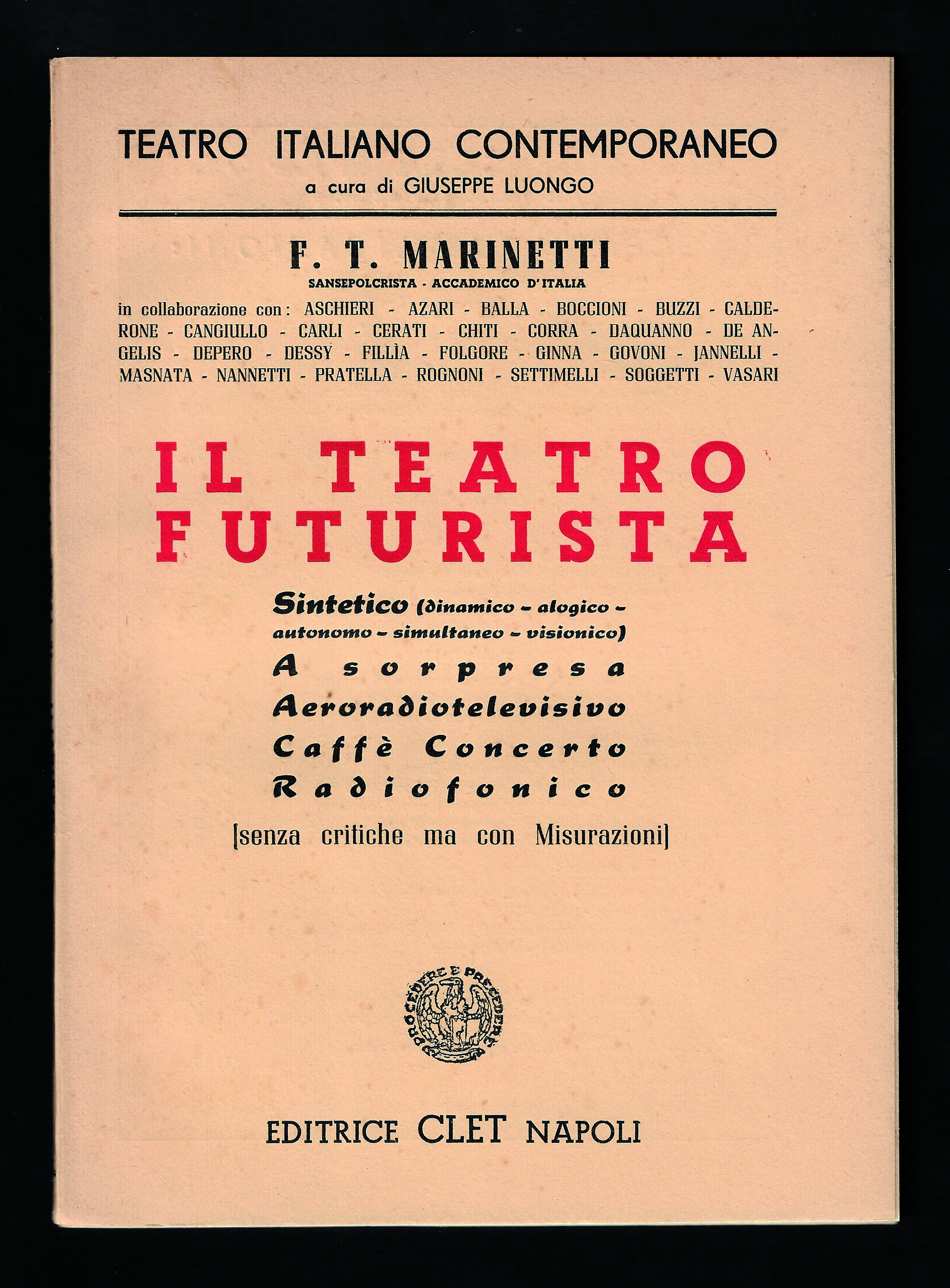 Descrizione: copertina con titoli in nero e rosso su fondo beige, una tavola in bianco e nero f.t. con 3 riproduzioni fotografiche (una delle quali ritrae Marinetti con B. Corra, E. Berti, G. Masi ed E. Settimelli). Con i manifesti «Il Teatro Futurista a Sorpresa» di Rodolfo De Angelis e «Non più critiche ma Misurazioni» di F.T. Marinetti, qui pubblicati per la prima volta. Esemplare in ottimo stato di conservazione. Prima edizione.