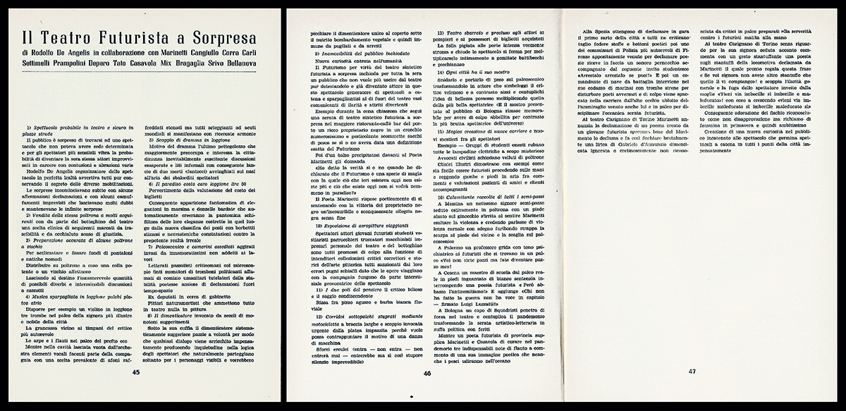 2) «Il Teatro Futurista a Sorpresa di Rodolfo De Angelis, in collaborazione con Marinetti, Cangiullo, Corra, Carli, Settimelli, Prampolini, Depero, Tato, Casavola, Mix, Bragaglia, Scrivo, Bellanova» (qui pubblicato in prima edizione).