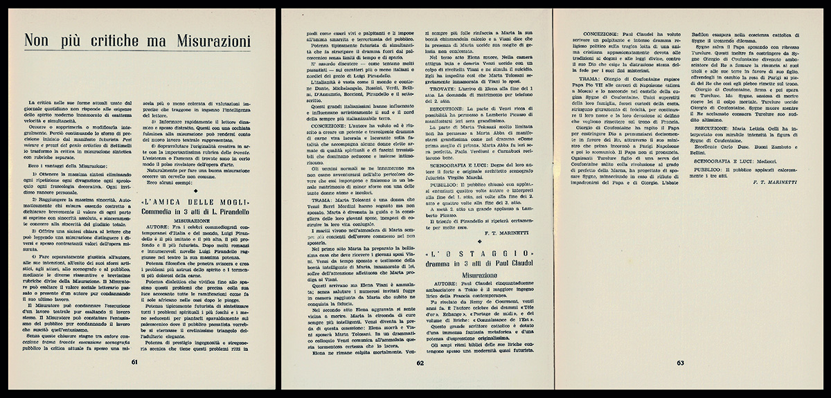 6) «Non più critiche ma Misurazioni» manifesto di F.T. Marinetti, qui pubblicato per la prima volta, con annesse due “misurazioni” («La commedia delle mogli. Commedia in 3 atti di L. Pirandello» e «L’ostaggio. Dramma in 3 atti di Paul Claudel»).