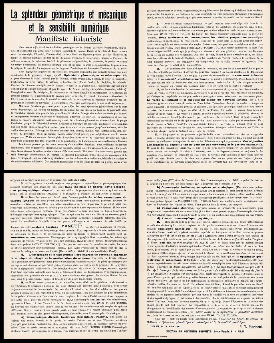 "Nous dégageons aujourd'hui du chaos des nouvelles sensibilité une nouvelle beauté que nous substituons à la première et que j'appelle Splendeur géometrique et mécanique. Elle a pour éléments le Soleil rallumé par la Volonté, l'oubli hygiénique, l'espoir, le désir, le périssable, l'éphémère, la force bridée, la vitesse, la lumière, la volonté, l'ordre, la discipline, la méthode; l'instinct de l'homme multiplié par le moteur; le sens de la grande ville; l'optimisme aggressif qu'on obtient par la culture physique et par le sport; la femme intelligente (plaisir, fecondité, affaires); l'imagination sans fils, l'ubiquité, le laconisme et la simultanéité qui caracterisent le tourisme, les grandes affaires et le journalisme; la passion pour le succès, le record, l'imitation enthousiaste de l'électricité et de la machine, la concision essentielle et la synthèse; la précision heuruse des engranages et des pensées lubrifiées; la concurrence d'énergies convergentes en une seule trajectoire".