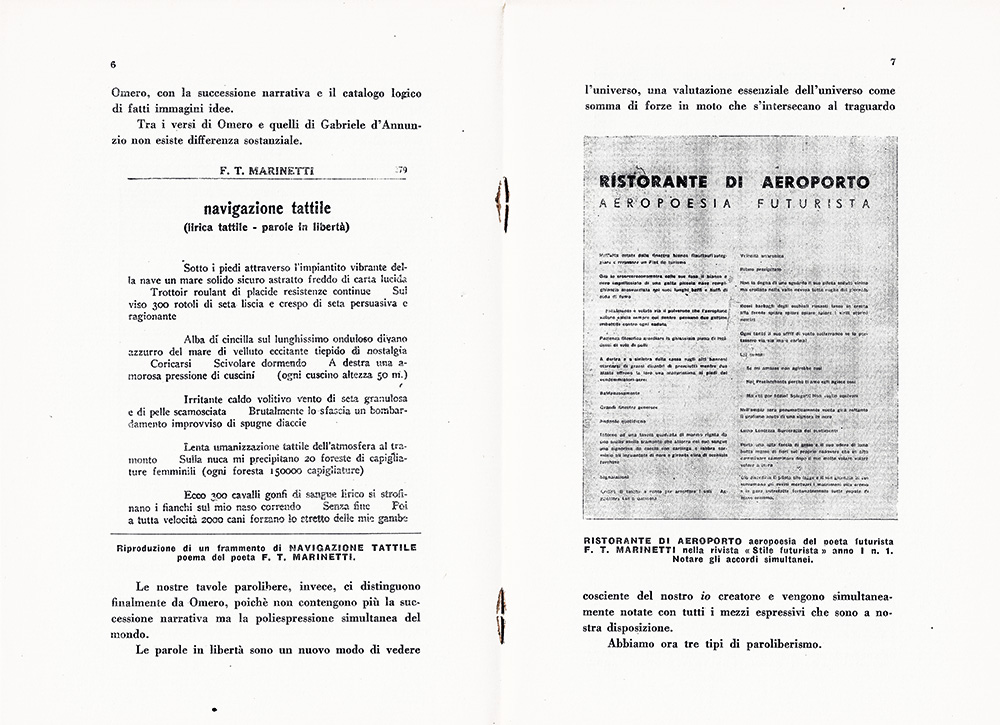 3. Parole in libertà di aeropoesia: "La tecnica di questa espressione sintetica della vita aerea è stata precisata da me in un manifesto. Tra di esse domina "l'accordo simultaneo". L'accordo simultaneo inventato da me è un seguito di corte verbalizzazioni essenziali sintetiche di stati d'animo diversi, parole in libertà che senza punteggiatura, verbi all'infinito, aggettivi-atmosfera a forte contrasto di tempi di verbi raggiungono il massimo dinamismo polifonico aviatorio pur rimanendo comprensibili e declamabili" (pp. 11-12).