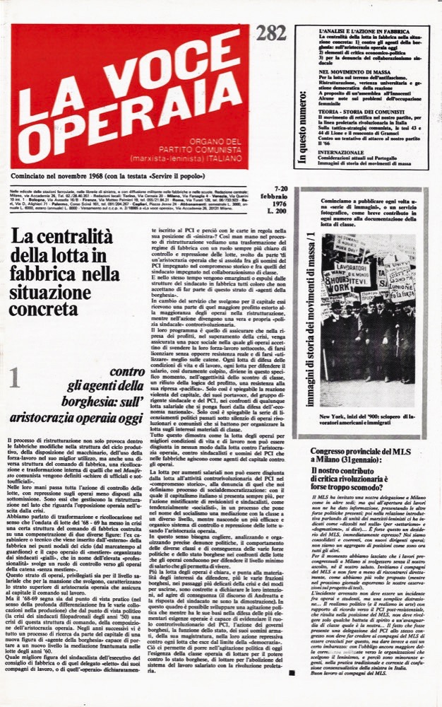 - n. 282 (7-20 febbraio 1976): pp. 8, alcune immagini fotografiche n.t. Per la rubrica «Serie di immagini»: 4 fotografie di «Immagini di storia del movimento di massa» (dai primi anni del 1900 al '68). Fra i vari articoli, tutti anonimi o firmati con le sole iniziali: «La centralità della lotta in fabbrica nella situazione concreta»; «Per la lotta sul terreno dell'antifascismo»; «Ristrutturazione, vertenza universitaria e gestione democratica della reazione». € 20