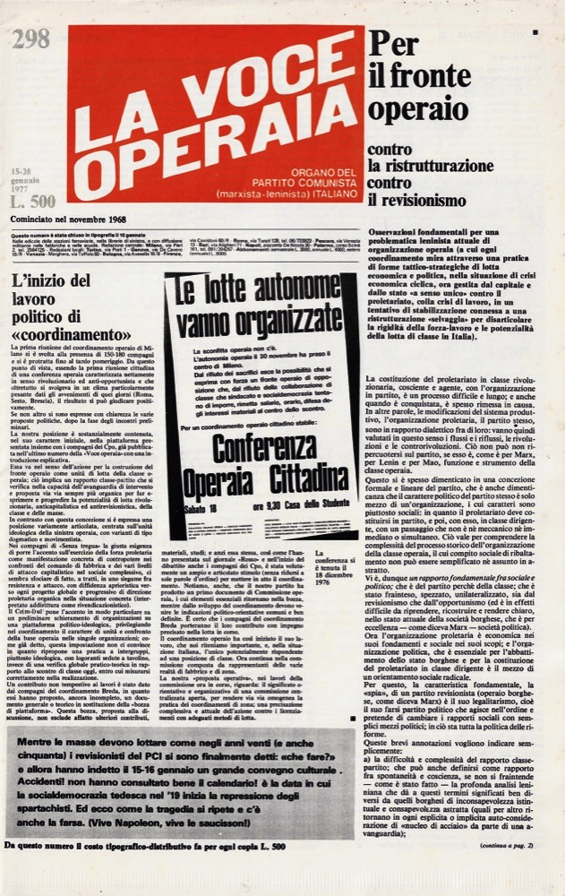 - n. 297 (11-25 dicembre 1976): pp. 20, riproduzione in copertina del volantino distribuito durante la manifestazione del 30 novembre 1976 a Milano («No al collaborazionismo sindacale - unità proletaria contro il capitale»), alcune riproduzioni di documenti n.t e 1 vignetta satirica in ultima pagina («Wanted»). Fra i vari articoli, tutti anonimi o firmati con le sole iniziali: «Bozza di piattaforma per il coordinamento operaio (Milano) - proposta dal P.C.(m.l.) e da Autonomia Operaia - C.P.O.»; «Discussione sulla tematica dell'incontro di circoli giovanili alla Statale di Milano»; «Obiettivi attuali della Sezione culturale (scuola e lavoro intellettuale)»; «Elementi di analisi della ristrutturazione della realtà di fabbrica oggi (lavoro delle cellule di partito): Fiat, Piaggio, Montedison di Porto Marghera, Anic di Ottana, Italsider». Una immagine fotografica a pag. 15 sul processo ai NAP: «Sud. Proletari in rivolta - Facciamo diventare il processo ai compagni dei N.A.P. base di partenza di un dibattito sulla lotta armata». € 20