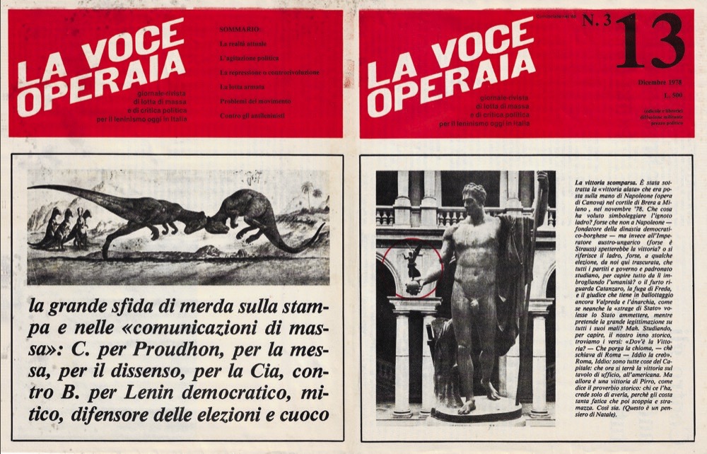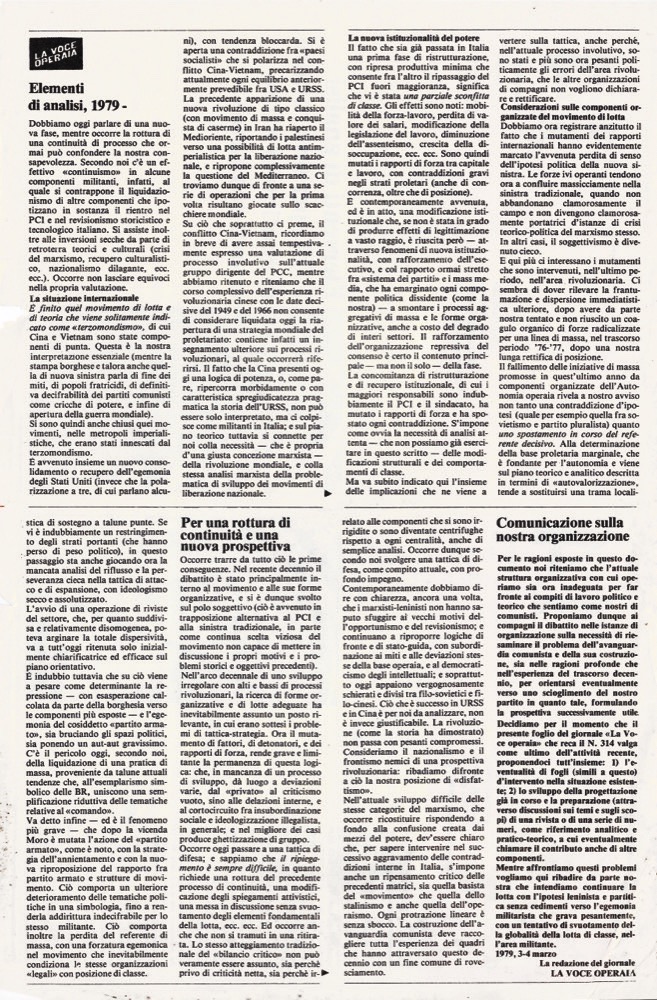 - n. 312 (ottobre 1978): pp.15 (1), non cambia il formato ma l'ultima pagina è divisa in modo che il fascicolo possa essere piegato in due presentando una doppia copertina, una con il titolo della testata, l'altra con il sommario, illustrata con 2 fotomontaggi in bianco e nero, alcune immagini in bianco e nero n.t. Fra i vari articoli, tutti anonimi o firmati con le sole iniziali: «Il senso della lotta di massa non è semplicemente il rapporto con le masse: azzoppaggi, pseudo-leninisti, autonomia e noi»; «Dossier sull'inverno dei contratti»; «Robotica nella discussione dei compagni di Torino»; «Teatri di guerra nel mondo: Iran»; «Sui problemi del movimento e di situazione in Italia». € 20