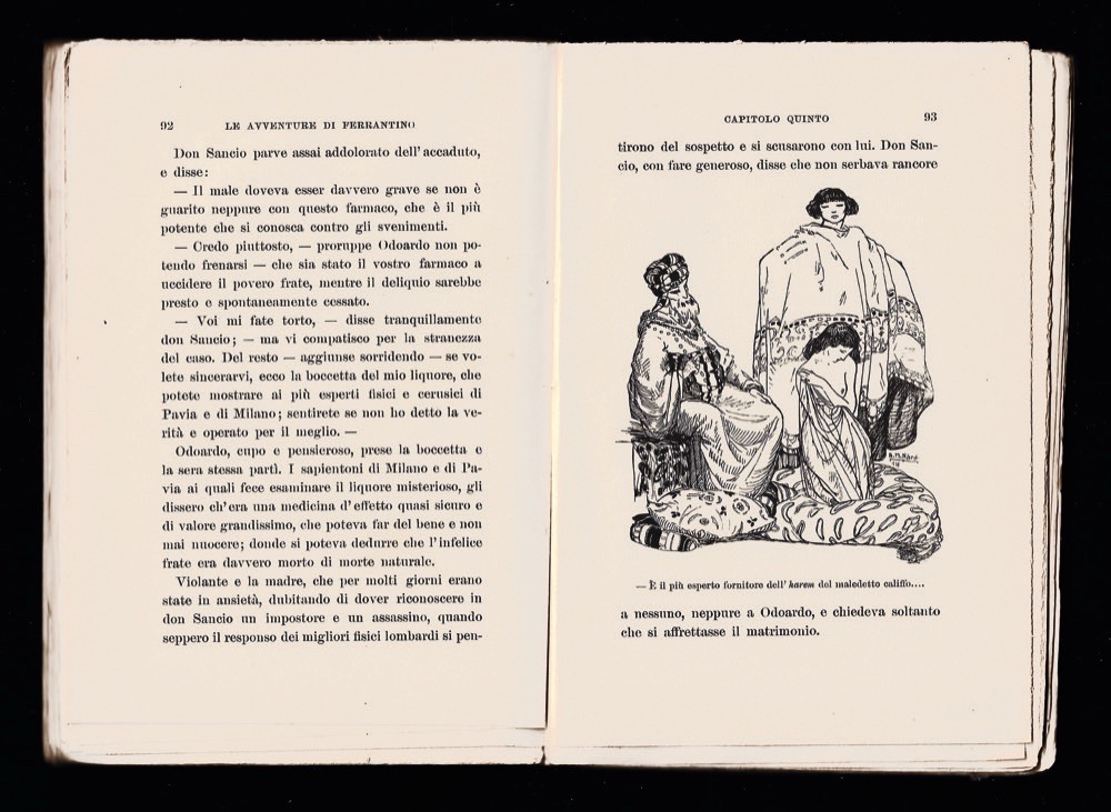 Descrizione: copertina illustrata con un disegno in nero e arancio, 1 vignetta al tratto al frontespizio, 5 illustrazioni a piena pagina e 25 vignette in bianco e nero e al tratto n.t. di Antonio Maria Nardi (Ostellato 1897 - Bologna 1973). Esemplare mancante delle pagine 213/214 e 215/216, in buone condizioni di conservazione. Prima edizione.