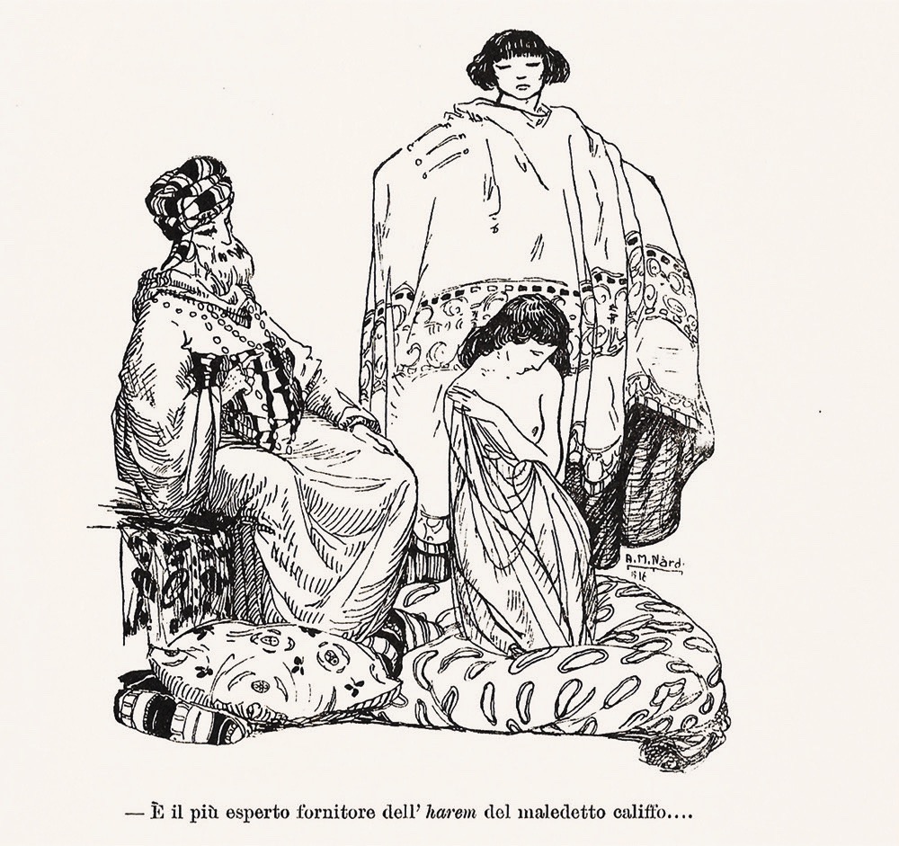La veste della fanciulla raffigurata nella vignetta a pag. 93 lascia scoperto uno dei seni, un particolare del tutto inusuale nella letteratura per ragazzi, e la didascalia recita: "E' il più esperto fornitore dell'harem del maledetto califfo".