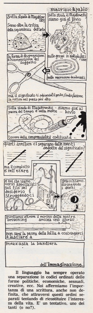 Descrizione: una vignetta in prima pagina, alcune immagini fotografiche in bianco e nero n.t. fra cui una di Tano D’Amico («Continuano blocchi dell’Italsider a Taranto»); una storia a cura di "Maurizio [Gabbianelli] e Pablo [Echaurren]": «Sulla strada di Majakovskij», con disegni di Pablo Echaurren, accompagnata da u commento: "Il linguaggio ha sempre operato una separazione in codici ordinati delle forme politiche, economiche, sessuali, creative, ecc. Noi affermiamo l'importanza di una scrittura, anche non definita, che attraversi questi ordini separati tentando di ricostituire l'interezza della vita. E' un tentativo, uno dei tanti (o no?)” (Maurizio Gabbianelli e Pablo Echaurren, pag. 9). Edizione originale.