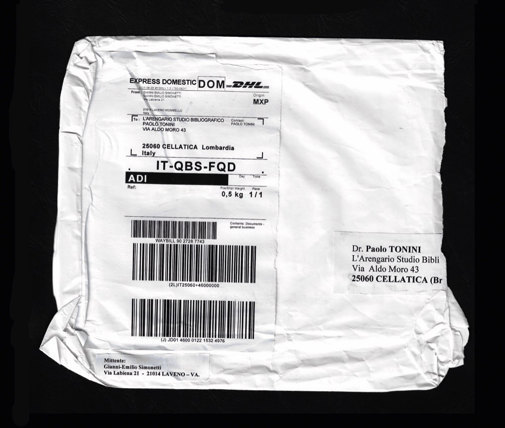 Descrizione: modello originale, riproduzione di un disegno a china in nero e arancio, utilizzato poi con diverse variazioni di colore nei 12 originali multipli allegati alla tiratura speciale del catalogo «Gianni Emilio Simonetti. Catalogo documentaro 1956-2025» (Cellatica, L'Arengario S.B., 2025). Titolo manoscritto al verso, timbro de «L'Arengario Studio Bibliografico» e monogramma autografo d Paolo Tonini. ALLEGATO: busta originale di spedizione del modello e dei 12 multipli originali.