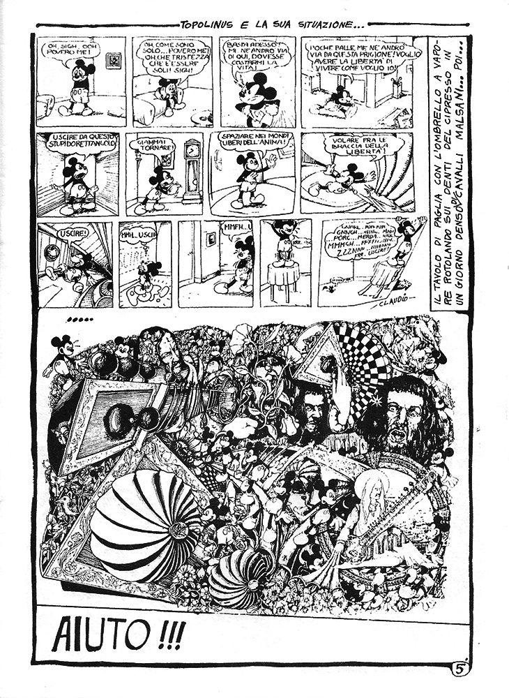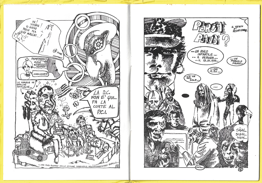 Descrizione: copertina illustrata a fumetti stampati in rosso su fondo giallo di Max Capa. Opuscolo interamente illustrato con storie a fumetti in bianco e nero di Max Capa, Claudio Mellana, "Rauch 73", "Origa", "Braschi", "Marco", "Jannuzzi", e altri non identificati. Esemplare completo di inserto editoriale: «Titolo n. 2», 21,7x15,8 cm., foglio impresso al recto e al verso, dedicato al progetto di un festival per il giugno 1974. Ottimo stato di conservazione. Edizione originale.