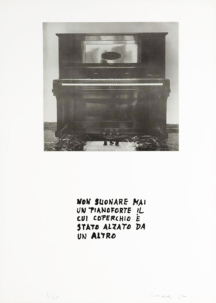 Opera pubblicata nella cartella «Non c’è musica più bella di quella che sto ascoltando ora», (Macerata) Artestudio Macerata, s.d. (1972), costituita da 8 litografie numerate e firmate di Giuseppe Chiari.