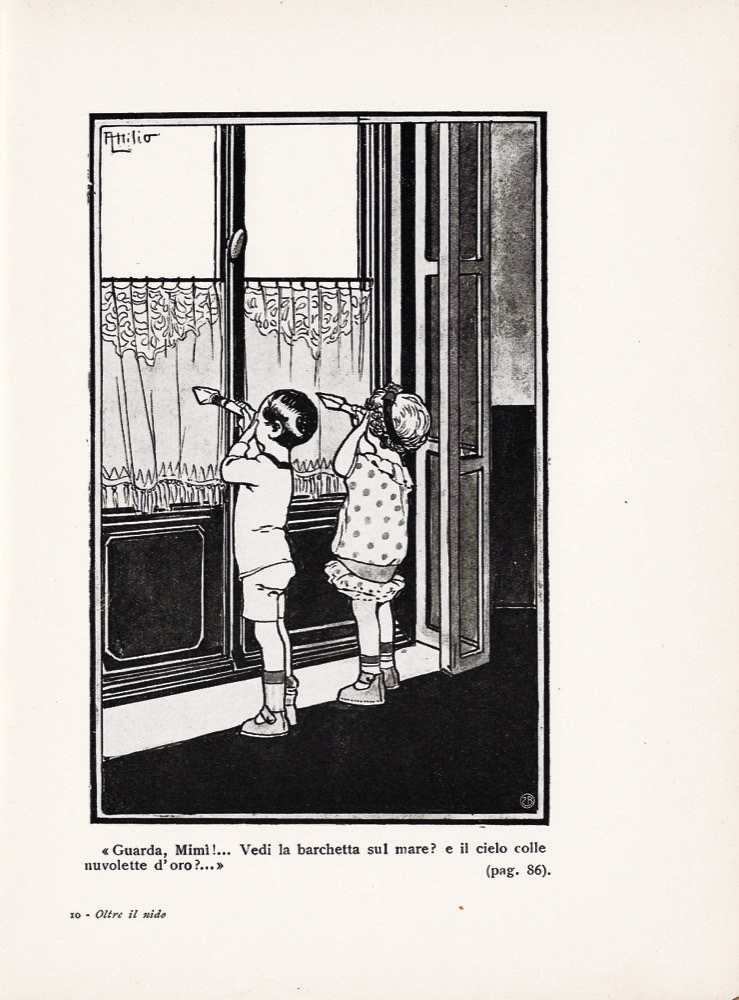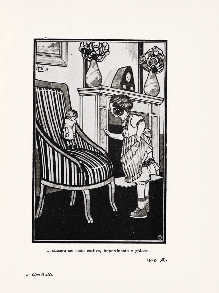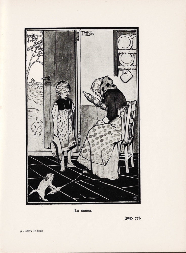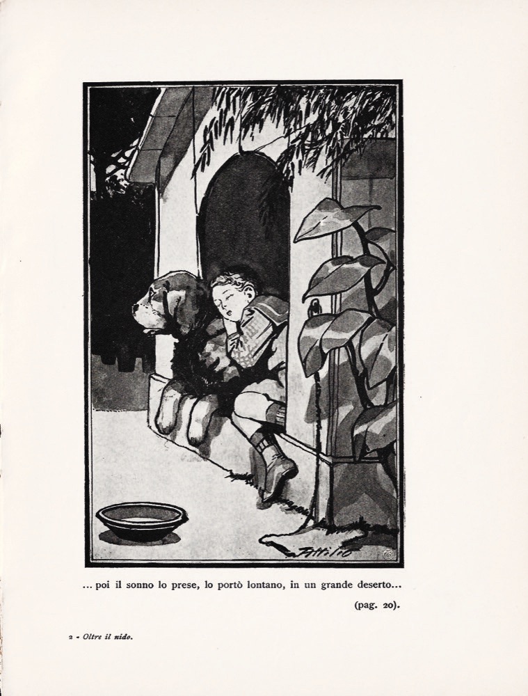 Descrizione: copertina illustrata con una immagine incisa in bianco e bleu su fondo grigio e 12 tavole a mezza tinta f.t. di Attilio Mussino (Torino 1858 - Cuneo 1954). Esemplare mancante del frontespizio ma in buono stato di conservazione. Prima edizione.