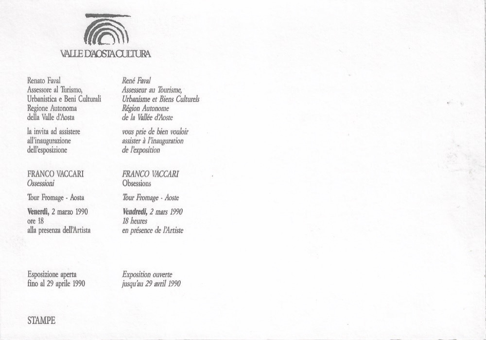 Descrizione: riproduzione a colori di un codice a barre bianco e nero su fondo verde e bordino giallo. Esemplare viaggiato, con timbro postale in rosso in data "21.II.90" e indirizzo apposto a mano. Invito originale alla mostra (Aosta, Tour Fromage, 2 marzo - 29 aprile 1990).