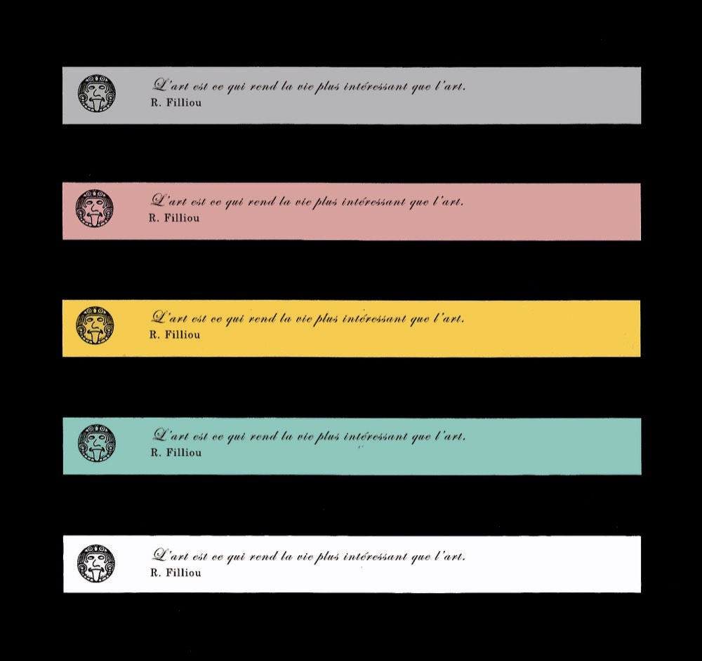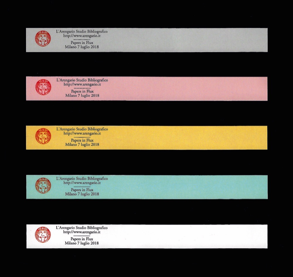 Descrizione: Ciascun papillon reca al recto, in nero, la citazione di un artista fluxus e al verso, in nero, la dicitura: «L'Arengario Studio Bibliografico - http//www.arengario.it - Papers in Fluxus - Milano 7 luglio 2018», con l'immagine simbolo di Fluxus (tratta dal monolite azteco «La piedra del sol» e ridisegnata da George Maciunas), impressa in rosso. Ogni citazione è riprodotta in un gruppo di 5 papillons, stampati rispettivamente in grigio, rosa pallido, giallino, celeste e bianco. Papillons originali, pubblicati in occasione della mostra «Papers in Flux» (Milano, Studio Guenzani, 7 luglio 2018): nel giorno dell'inaugurazione vennero sparsi casualmente in aria in mezzo al pubblico da una giovane donna, a passo di danza.