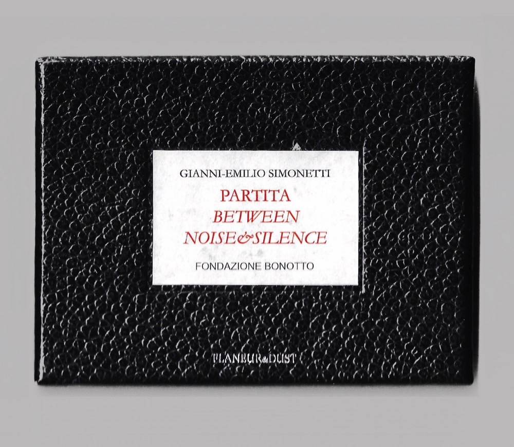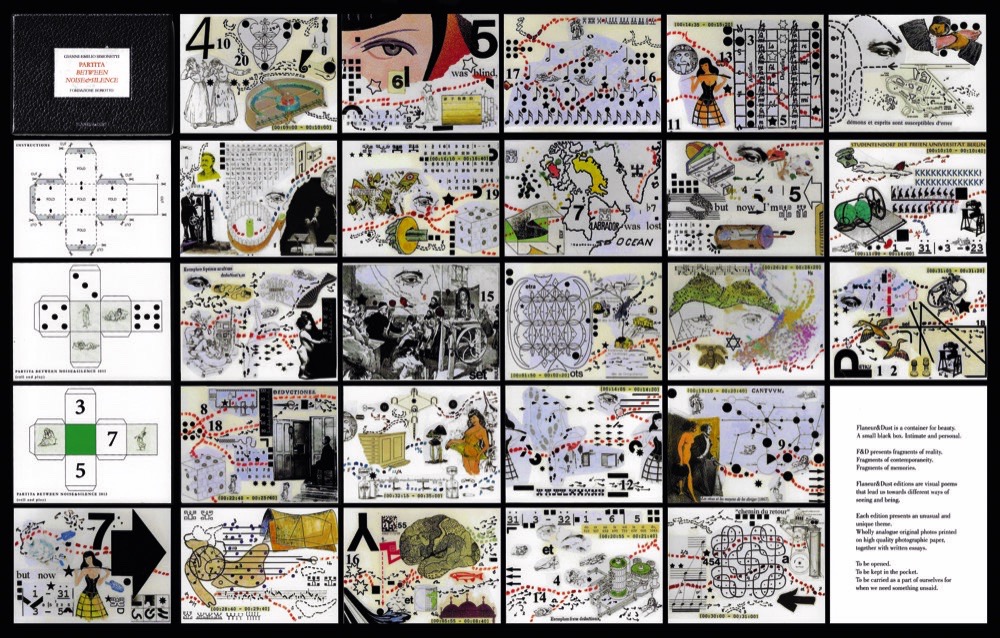 Descrizione: etichetta con titoli in nero e rosso applicata al coperchio, titolo della serie impresso in oro. La scatola contiene 27 carte da gioco 7,5x10 cm. in nero e a colori che riproducono collage e disegni dell'autore, 2 plaquettes e 1 foglietto volante con i testi. Una plaquette misura 10x7,5 cm. ed è costituita da due foglietti ripiegati in otto parti per un totale di 16 pagine numerate. La prima plaquette reca il frontespizio con titoli in nero e rosso, la pag. 2 la dicitura «Istruzioni per l'esecuzione» ripetuta in 15 lingue differenti, tutte le altre pagine sono bianche. La seconda plaquette, misura 10,5x7,3 cm. ed è costituita da 4 pagine: la prima pagina reca il titolo della serie "Flaneur&Dust", la pag. 3 un testo in inglese che spiega natura e finalità dell'oggetto. Il foglietto volante misura 10,5x7,3 cm. e contiene un testo in lingua inglese che definisce le finalità della Fondazione Bonotto: approfondire il rapporto interdisciplinare fra le arti e promuovere la loro relazione con il mondo dell'artigianato e della produzione industriale. Tiratura non dichiarata. Esemplare con firma autografa dell'autore al frontespizio della prima plaquette. Edizione originale.
