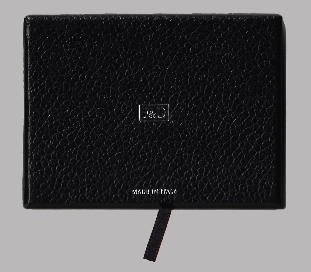 Dimensioni: scatola in cartoncino rigido nero goffrato 9x12x1,5 cm.