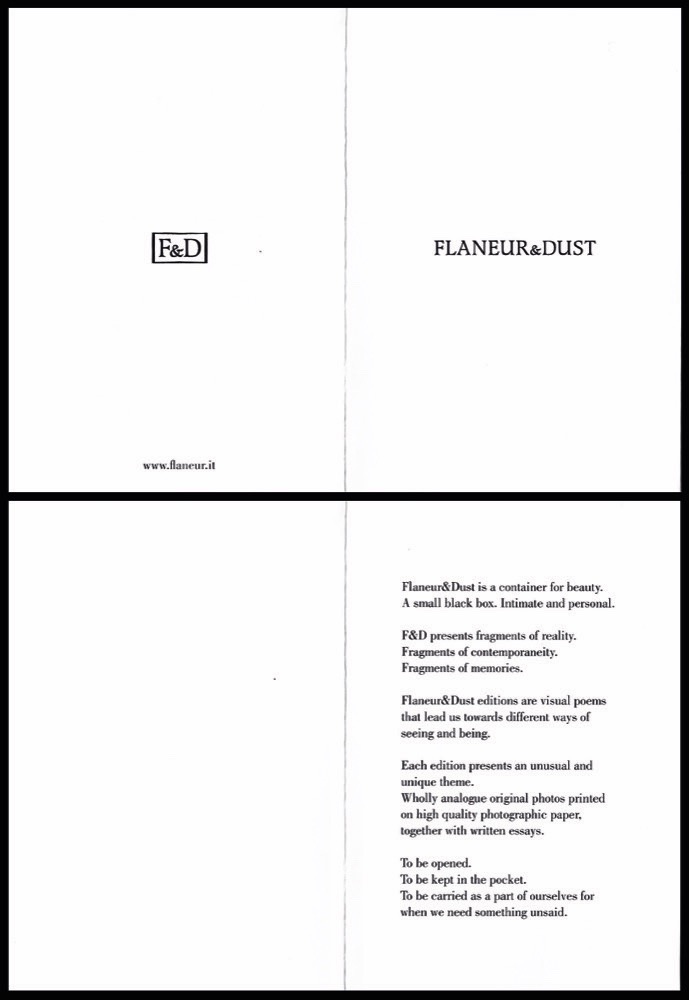 Testo: "«Flaneur&Dust» is a container for beauty. A small black box. Intimate and personal. F&D presents fragments of reality. Fragments of contemporaneity. Fragments of memories. «Flaneur&Dust» editions are visual poems that lead us towards different ways of seeing and being. Each edition presents an unusual and unique theme. Wholly analogue original photos printed on high quality photographic paper, together with written essays. To be opened. To be kept in the pocket. To be carried as a part of ourselves for when we need something unsaid" (testo del foglietto volante).