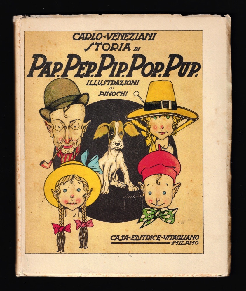 “Pap è il papà, grand’uomo di tesa sopraffina; / Pep è la mamma d’indole pepata anziché no; / Pip è la figlia e spesso la chiamano Pipina; / Pop è il figliolo il qual chiamasi può Popò; / e Pup infine è il cane, bestia arcisingolare / che sa nuotar nel cielo e sa volar nel mare, / abbaia stando zitto, dorme restando sveglio, / qual altro cane al mondo saprà far mai di meglio? // Questi cinque personaggi / sono cinque rarità, cinque menti, cinque saggi, cinque genî messi là. / Inventori e scopritori / d’ogni fatto sovruman / tutti cinque, sissignori / padre, madre, figli e can!” (pp. 7-8).