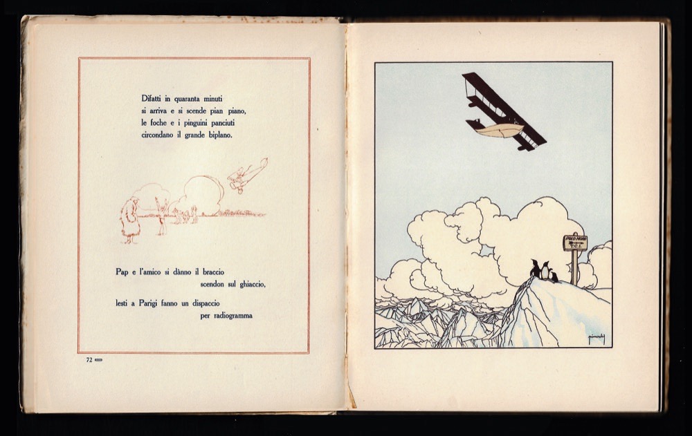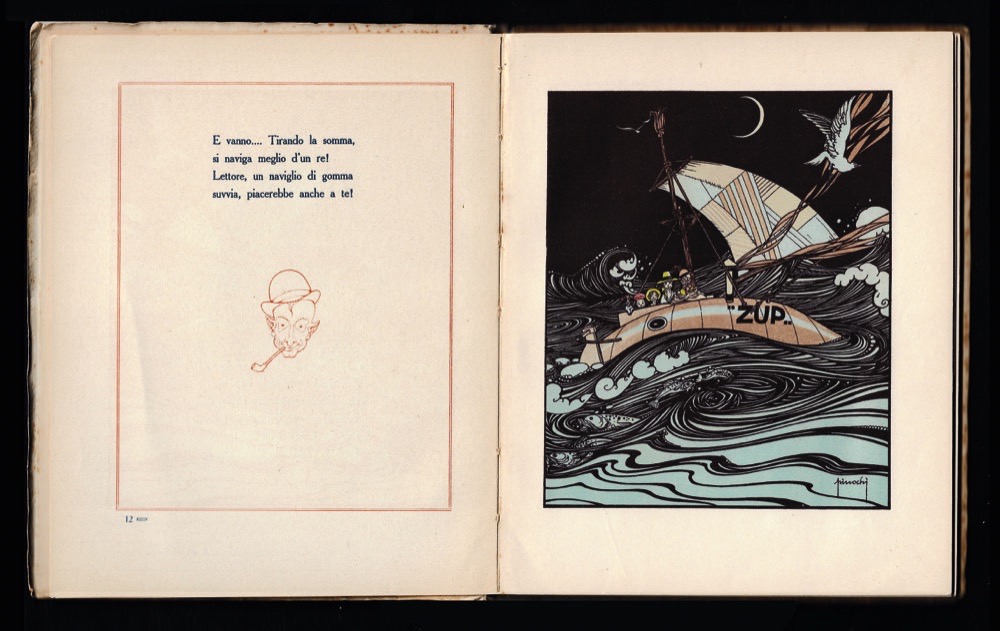Descrizione: copertina illustrata con un disegno a colori, 10 tavole a colori f.t., alcune vignette, testatine e finalini a sanguigna n.t. di Enrico Mauro Pinochi (Mozzano, Lucca 1900 - Buenos Aires 1965). Storia in rima, in forma di poemetto. Testo stampato in bleu inquadrato in cornice in bistro. Esemplare in ottimo stato di conservazione. Prima edizione.