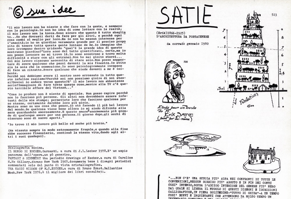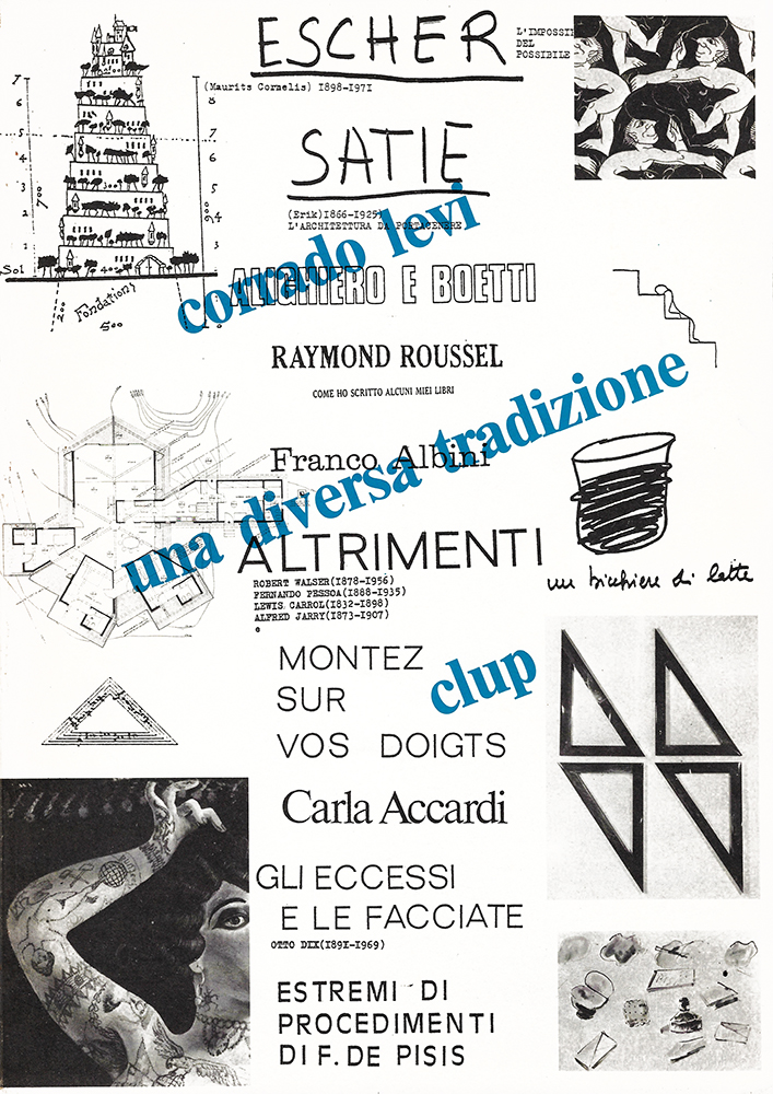 I 10 capitoli: 1) Esher. L'impossibile del possibile; 2) Satie. L'architettura da portacenere; 3) Alighiero e Boetti; 4) Franco Albini; 5) Raymond Roussel. Come ho scritto alcuni dei miei libri; 6) Altrimenti. Robert Walser - Fernando Pessoa - Lewis Carroll - Alfred Jarry - e; 7) Gli eccessi e le facciate. Otto Dix; 8) Montez sur vos doigts; 9) Carla Accardi; 10) Estremi di procedimenti di F. de Pisis; Postfazione: una diversa tradizione.