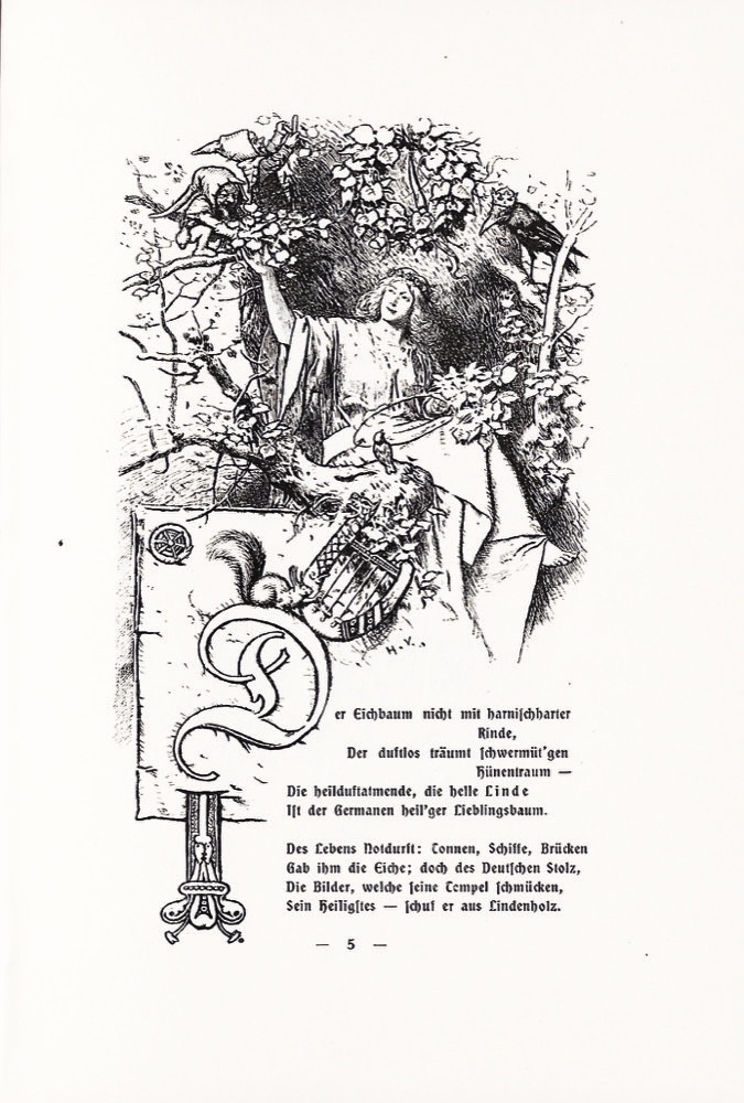 Descrizione: copertina illustrata con un disegno decorativo a colori su fondo oro e verde, 1 illustrazione al tratto al frontespizio, 1 testatina e 1 finale in nero di Hermann Vogel (Plauen, 1854 - Burgstein, Krebes, 1921). Raccolta di poesie. Esemplae in eccellente stato di conservazione. Quinta edizione.