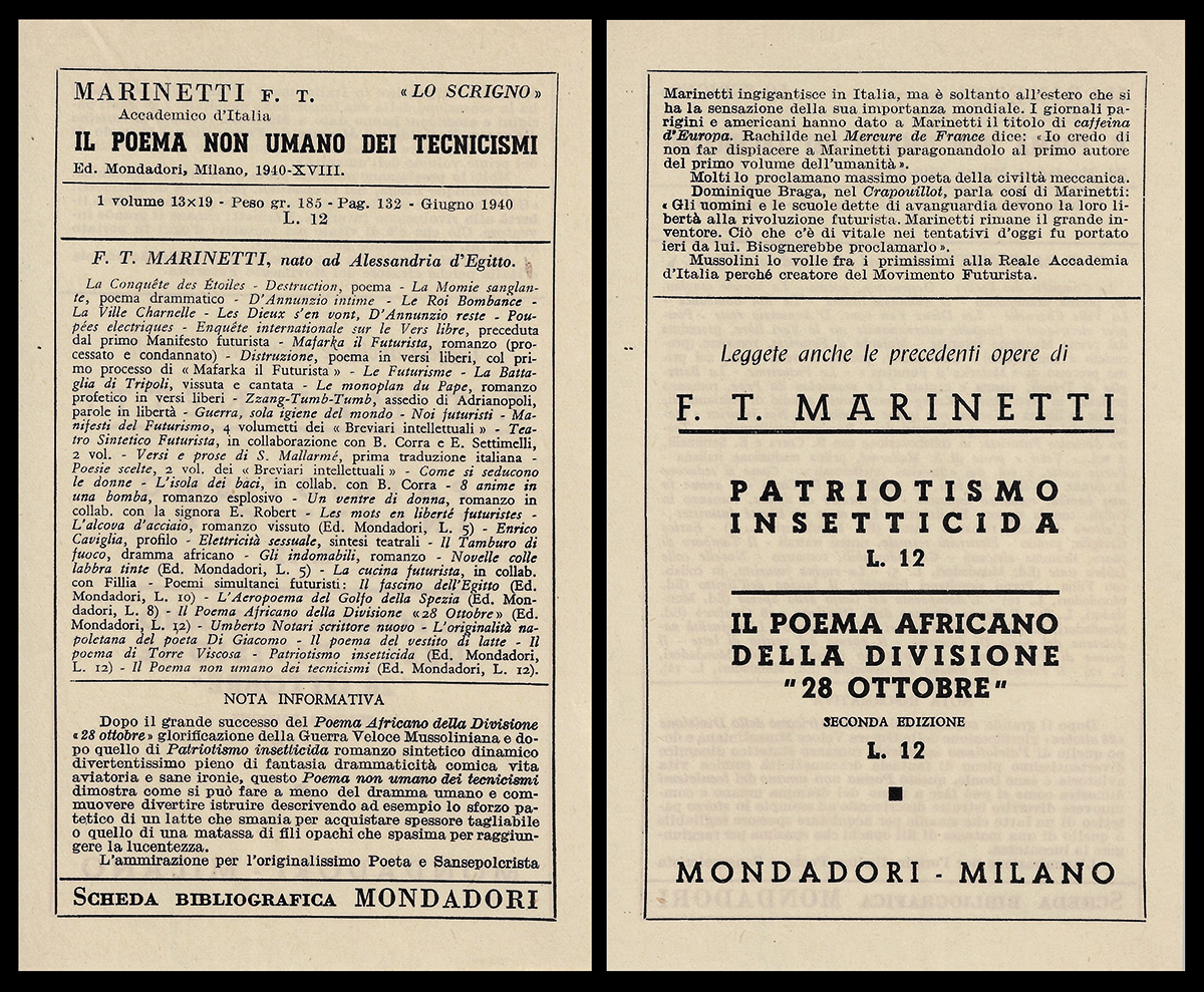 Descrizione: scheda bibliografica pubblicitaria originale, con una bibliografia e una nota informativa su Marinetti.