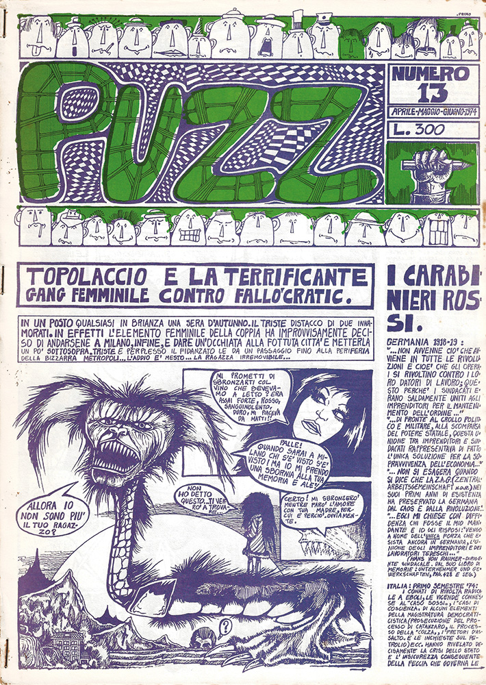 Sommario: Anonimo (Max Capa), «Topolaccio e la terrificante gang femminile contro Fallocratic» (racconto a fumetti); Nucleo Puzz, «I carabinieri rossi»; La Vecchia Talpa - Napoli, «La teoria rivoluzionaria è ora nemica di ogni ideologia rivoluzionaria»; G.P,, «Oh Patria...»; Anonimo, «Normale anormale normale» (racconto a fumetti); Piero Coppo, «Acido e lotta di classe»; «La libertà ritrovata all'improvviso è come una droga»; Andrea Rauch, racconto a fumetti senza titolo; Anonimo, «Definizione minima del movimento studentesco» (striscia a fumetti a imitazione di Charles M. Schulz); Anonimo (Max Capa), «Lo spettacolo è finito... Situazione creativa 13-14-15 giugno 1974 Castelletto di Cuggiono - zona: Diga Ticino» (pagina pubblicitaria dell'evento); Anonimo «L'assoluto negativo - parte I» (racconto a fumetti); Negation, «Deturnare»; Giancarlo Pavanello, «Parliamo di sesso, stasera, amore...» (grande vignetta a fumetti). Con la riproduzione del Comunicato n. 6 delle Brigate Rosse tratto dal Corriere della Sera del 19 maggio 1974, sotto il titolo: «Deturnato»; due pagine di controinformazione, collages di articoli di giornale: «Lo spettacolo e i suoi miasmi. ovvero: Non sentite la putrefazione del capitale penetrarvi nel sangue?).